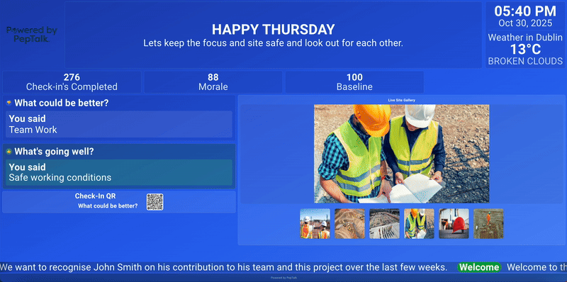 Your on-site digital noticeboard. Site Pulse displays morale trends, key risks, and action updates in real time on TV screens across your project. Workers can see that their feedback is being heard, leaders can reinforce site priorities, and everyone stays aligned on what’s improving. This quarter’s update brings faster loading, cleaner design, and even clearer data visualization.